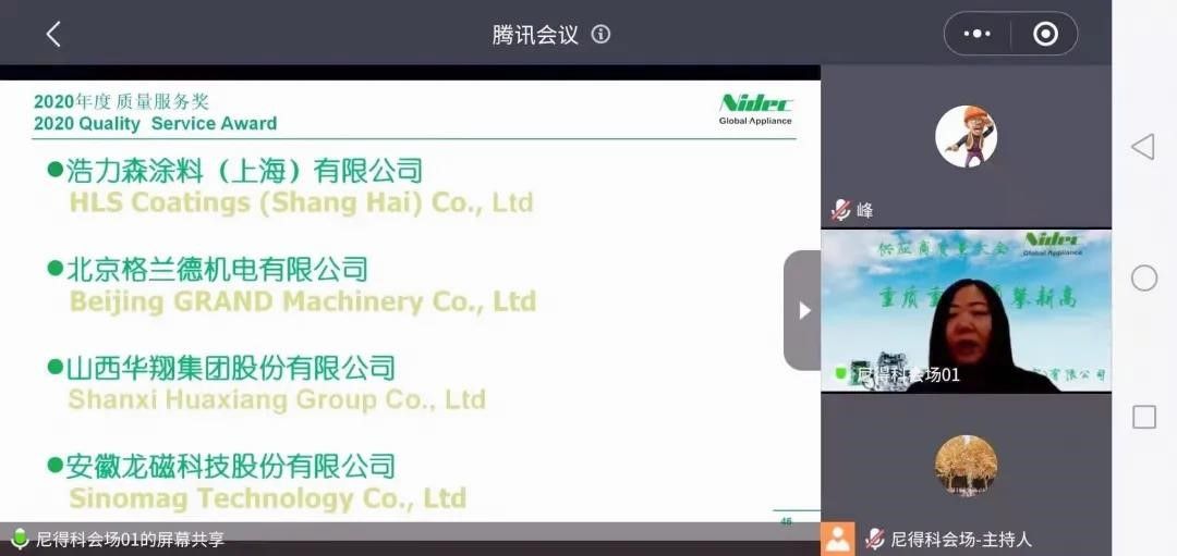 2021年1月,尼得科壓縮機(jī)(北京)有限公司舉行了"2020年度供應(yīng)商質(zhì)量大會",由于疫情影響,為了響應(yīng)國家號召,避免人員聚集,此次大會采用線上直播形式,全球各地的優(yōu)秀經(jīng)銷商代表、優(yōu)秀供應(yīng)商、以及其他相關(guān)部門工作人員等共同參與了此次直播。浩力森涂料榮獲了尼得科壓縮機(jī)“質(zhì)量服務(wù)獎(jiǎng)”,載譽(yù)而歸。