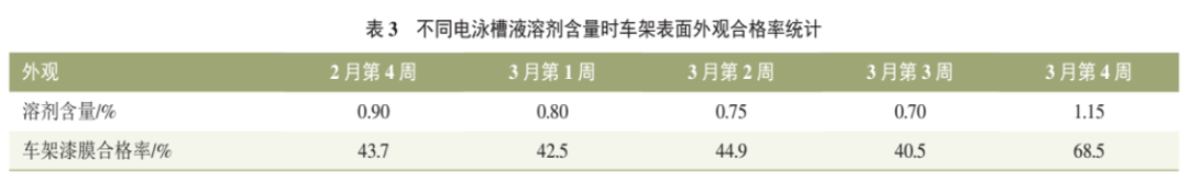 現(xiàn)場(chǎng)電泳槽液溶劑含量雖在工藝要求范圍內(nèi),但是整體偏低,提高溶劑含量可以明顯降低電泳漆膜外觀缺陷的發(fā)生率。2021年3月第4周一次性補(bǔ)加600kg溶劑,提高溶劑含量0.3%,漆膜外觀問(wèn)題明顯改善,車架漆膜合格率由40%提升至68%。