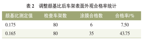 電泳涂裝的顏基比指電泳漆、槽液或漆膜中的顏料與基料(樹(shù)脂)之比,電泳槽液和新配的電泳原漆槽液顏基比應(yīng)是相同的,但在電泳過(guò)程中,顏料和樹(shù)脂不定按照原配比沉積到被涂物上,因而產(chǎn)生槽液、漆膜和原漆三者的顏基比不相同的現(xiàn)象,電泳槽液顏基比失調(diào)易產(chǎn)生縮孔粗糙、失光等漆膜弊病,影響漆膜性能,因此需要定期檢測(cè)槽液顏基比,按檢測(cè)結(jié)果添加乳液或色漿調(diào)整槽液的顏基比。電泳槽液顏基比技術(shù)要求在0.14~0.20范圍內(nèi),按照Q/JQ11219.4《涂料灰分、顏基比測(cè)定方法》進(jìn)行檢測(cè),顏基比雖在工藝要求范圍內(nèi),但是在明顯升高,通過(guò)調(diào)整顏基比范圍,使其降低至0.165左右,發(fā)現(xiàn)車架外觀糙合格率由7.5%提升至43.75%(見(jiàn)表2),故顏基比失調(diào)為電泳漆膜外觀的主要影響因素。