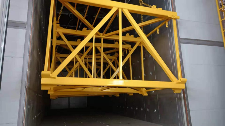 每次噴涂后設(shè)置閃干工序,確保大量揮發(fā)出來的水分能夠及時地排出,確保漆膜良好的外觀光澤;閃干工序之后設(shè)置烘干工序,完全干燥漆膜。一方面促進水性底漆表干,減少底面漆“濕碰濕”之間的閃干時間,提高生產(chǎn)效率。采用熱風(fēng)對流循環(huán)對結(jié)構(gòu)件表面進行加熱,為減少熱量交換的熱損失,采用效率相對較高的直燃式天然氣加熱方式。經(jīng)驗證明前道工件表面溫度以(15-35) ℃為宜,過高的溫度會影響底/面漆的流平和固化反應(yīng),可能產(chǎn)生起泡、干噴等缺陷,同時浪費烘烤能源。